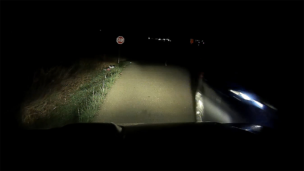 In Band's night time dashcam shot, you can clearly see him static on the grass verge. But hang on, there's a STOP sign in the photo ahead of Band. Suggesting a main road intersection, with drunken low-life driving his car up from the right, then drunkenly failing to make the left turn into the side road where Band is approaching the T Junction.