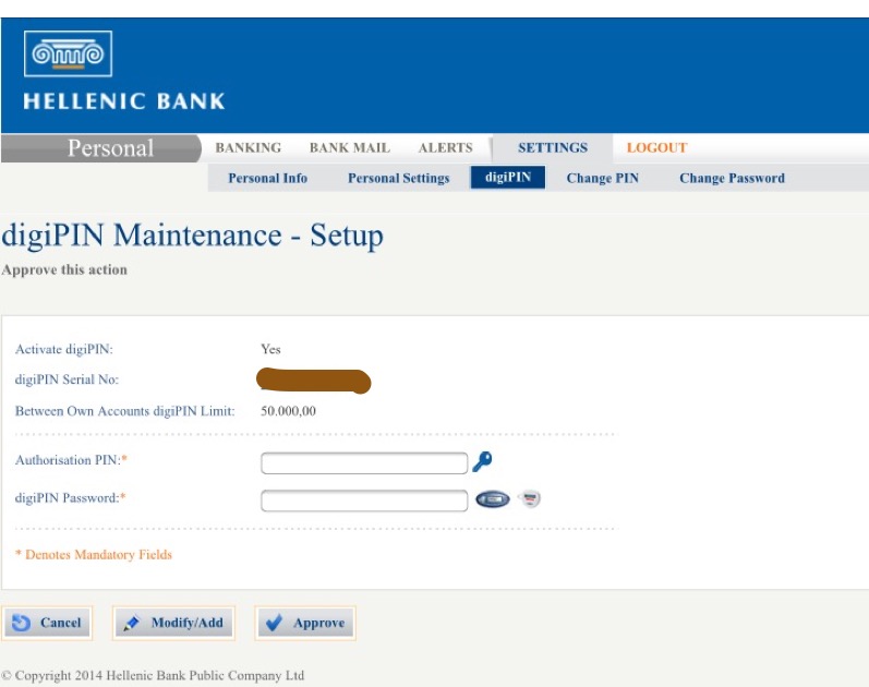 I have a Hellenic savings account and they gave me a digipin device . But I could not set it up on the Hellenic web site . It accepted the serial number but then wanted an "authorisation pin" which I do not have . I should go in and see them but I have managed 7 years without it so can't be bothered.